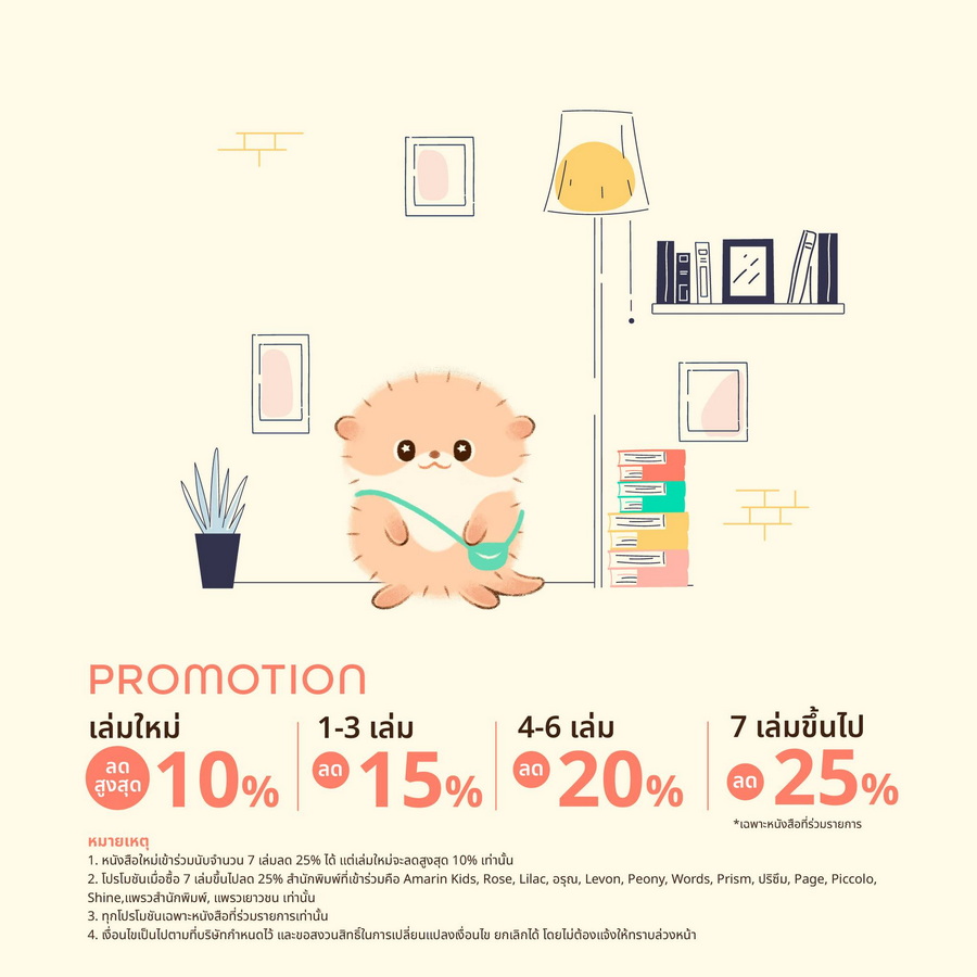 1. หนังสือใหม่เข้าร่วมนับจำนวน 7 เล่มลด 25% ได้ แต่เล่มใหม่จะลดสูงสุด 10% เท่านั้น